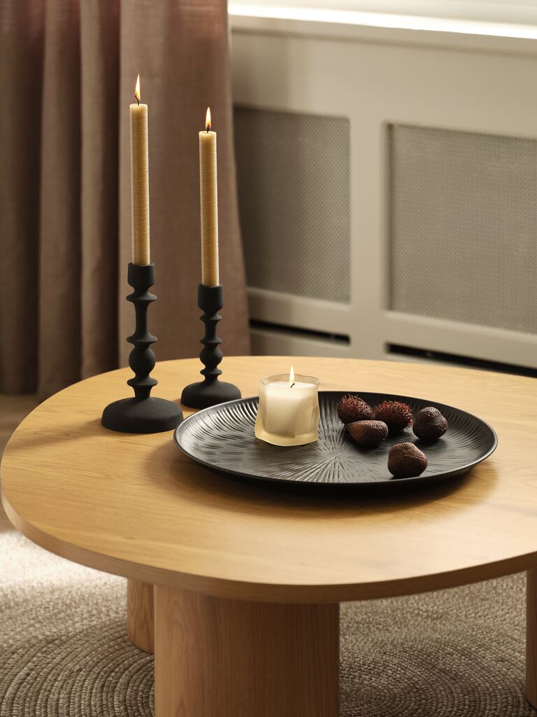 Черен декоративен поднос, изработен от стомана. Той има модерна кръгла форма и фин оребрен мотив. Идеален е за организиране на малки практични предмети или за елегантно излагане на декоративни елементи върху маса. Ø39 x В2 см