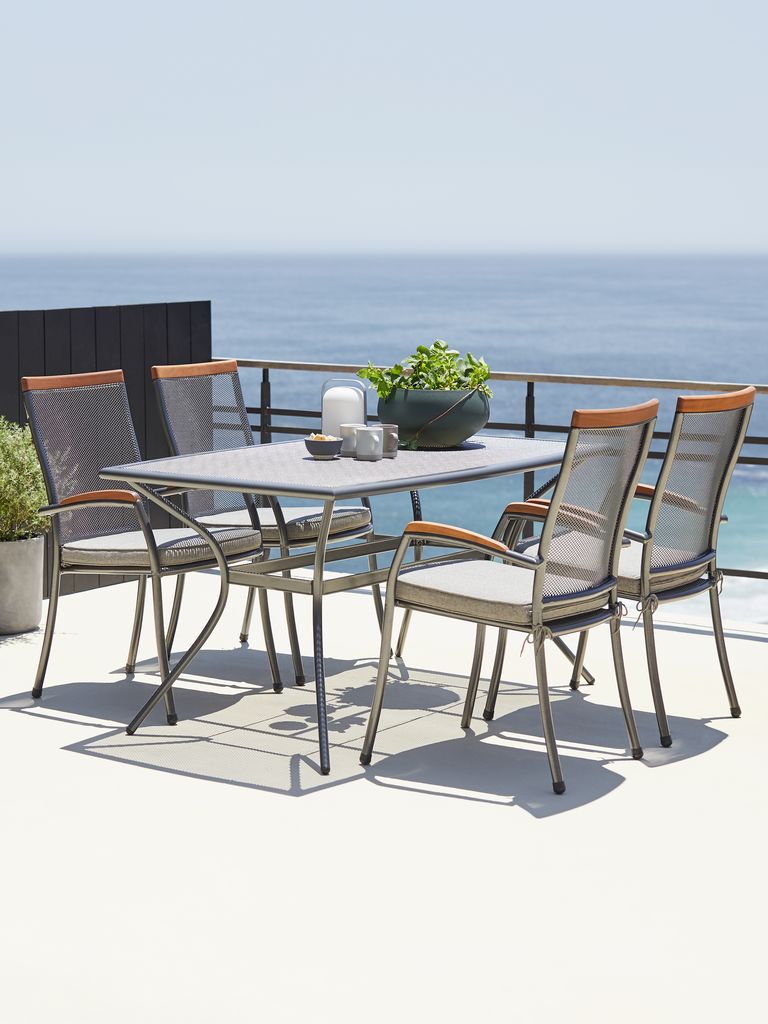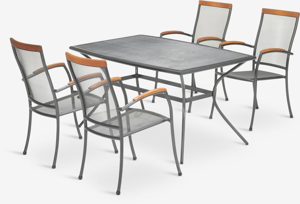 4-местен комплект градински мебели. Маса: Алуминий и стомана. С предпазващо от ръжда покритие Durasint®. Ш90 x Д150 x В74 см. Стол: Стомана и омаслена FSC® твърда дървесина. С предпазващо от ръжда покритие Durasint®. Стифиращ.