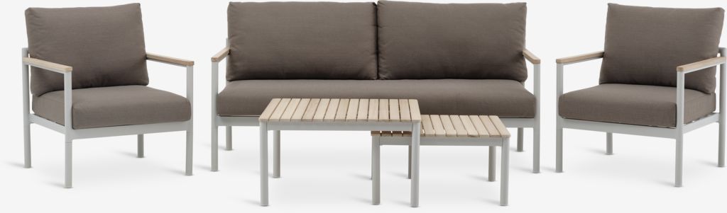 4,5-местен модулен комплект. Маса: Алуминий и омаслена FSC® твърда дървесина. Ш72/62 x Д72/62 x В39/32 см. 2,5-местен диван и стол: Алуминий и омаслена FSC® твърда дървесина. Вкл. луксозни възглавници с издръжлива тъкана олефинова калъфка. Олефиновият текстил е цветоустойчив и не абсорбира влага.