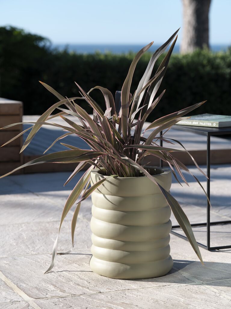 Градинска саксия в пепелявозелен цвят от устойчива на замръзване фиброглина. Тази градинска саксия има отличителен дизайн и гладко, матово покритие, което й придава модерен и стилен вид. Дренажният отвор гарантира, че излишната вода може да се отцеди. Ø30 x В35 см