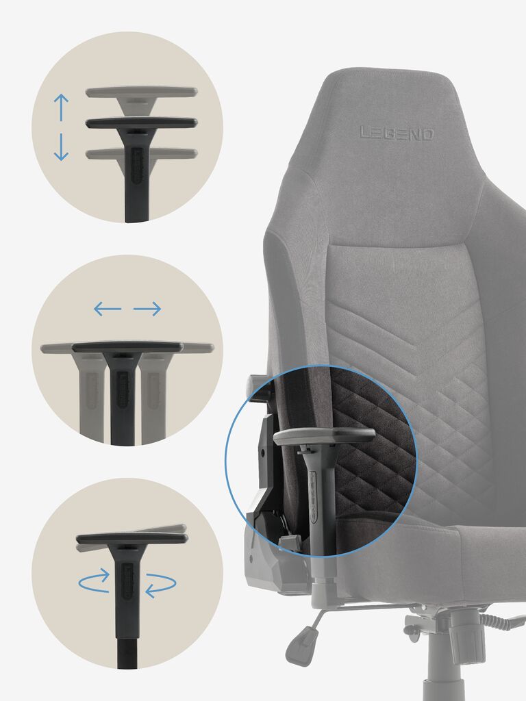 Подлакътниците могат да се регулират по височина, дълбочина и ъгъл (наляво/надясно). Движете ги нагоре или надолу според ръста си, напред или назад за различна позиция на тялото и завъртайте в кръг според естественото движение на ръцете.