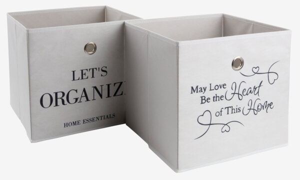 Бяла кошница с асорти дизайни и надписи. Лека и просторна кошница, която отговаря на различни нужди за съхранение. Включва стоманено оплътнени отвори, които служат за дръжки за лесно пренасяне. Ш32 x Д28 x В30 см